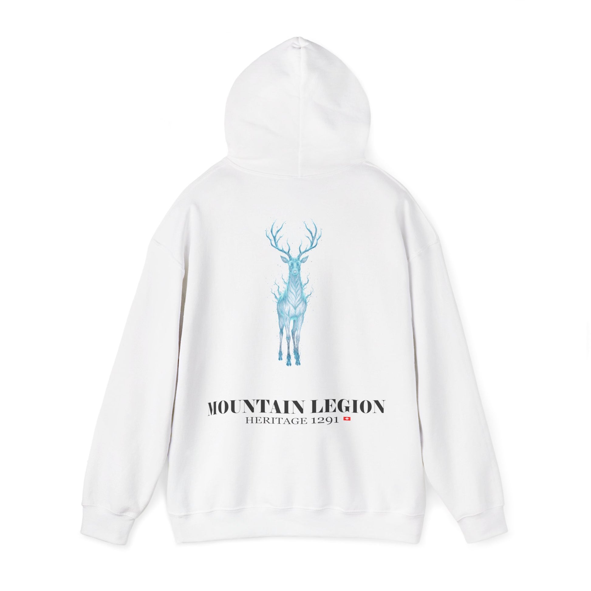 Le Sweat à Capuche Heritage 1291 est l'armure de l'homme fort, taillée pour braver les nuits d'automne et d'hiver en haute montagne. La face avant arbore la vision spectrale du grand cerf, une force mystique des cimes qui vous guide dans l'obscurité.