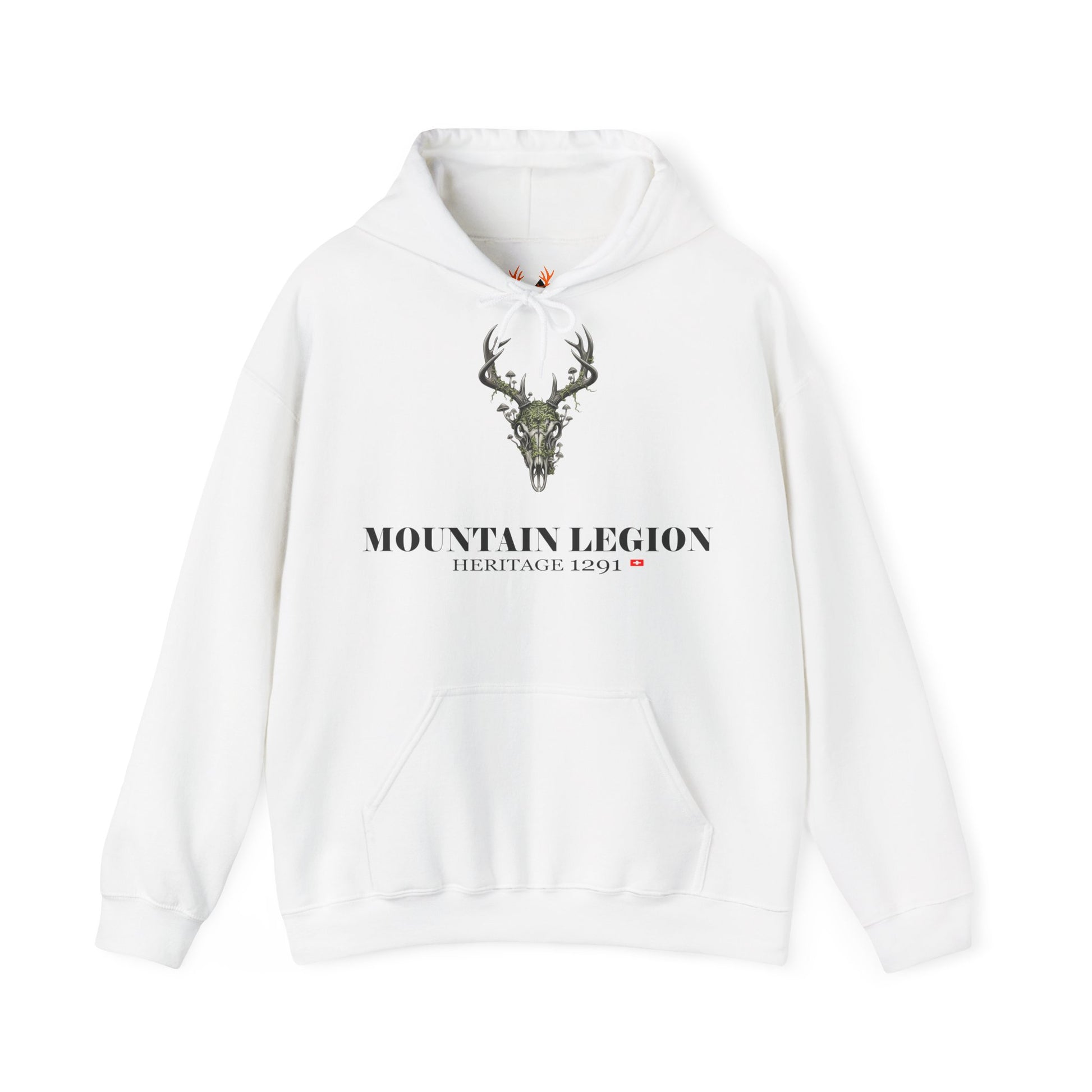 Le motif central est puissant : un crâne de cerf recouvert de mousse et de racines, emblème du cycle de vie et de la force éternelle des sommets. Il rappelle que la Légion est aussi ancienne et inébranlable que la roche.